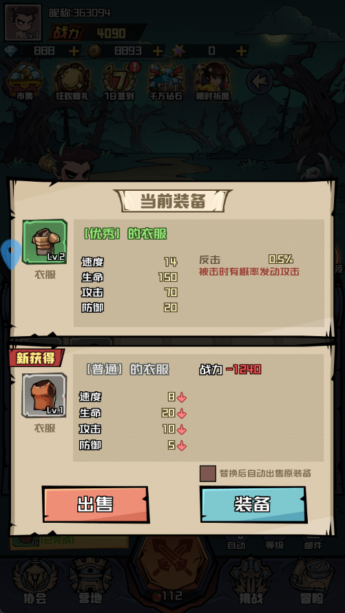 3、每次击败敌人都有几率掉落装备,界面上绿色箭头代表装备等级更高,可直接替换;红色箭头则为低级装备,建议出售换取金币。