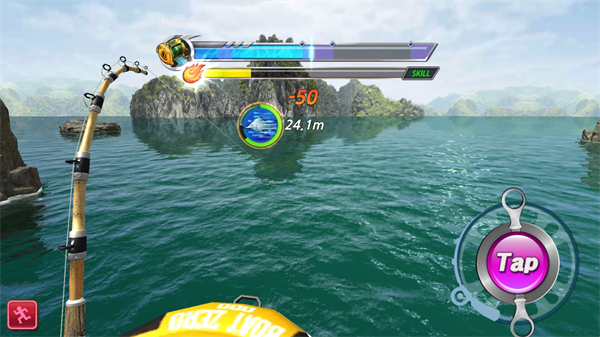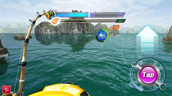 4、点击tap按钮将上方的进度条保持在紫色区间,这样可以积累能量,当能量满后向上滑动可以使用技能造成更多伤害减少鱼的血量。