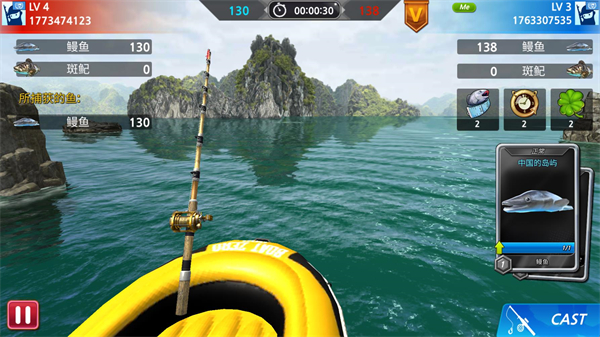 7、比赛开始后点击cast开始钓鱼,当玩家钓到指定的鱼时就会增加积分,时间结束后积分高的玩家会获胜。