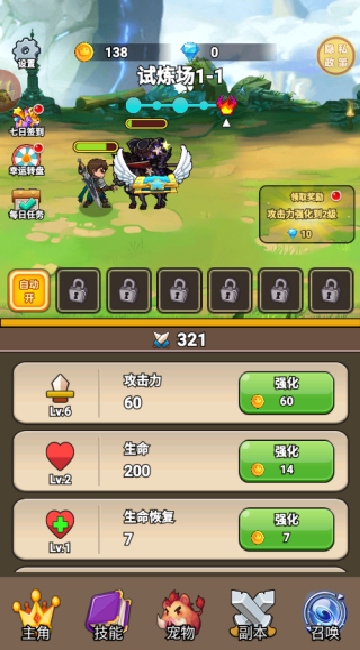 3、挑战金币钻石等各样副本,获得每天的资源奖励。