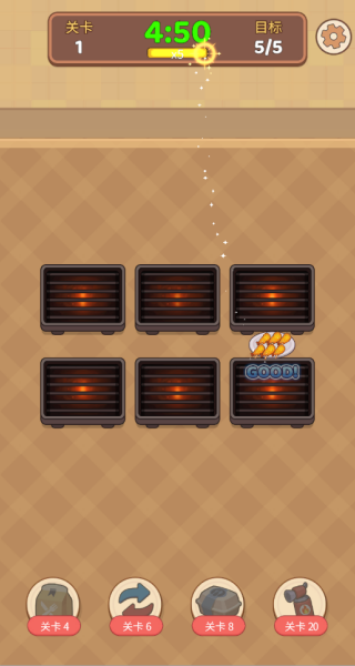 1、主要的玩法就是将关卡中的烤串,全部都消除完成关卡的任务。