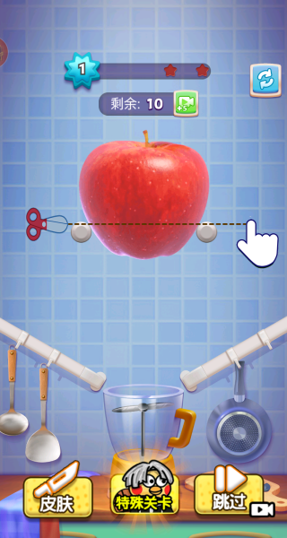 2、第一关是切苹果,你要根据手指的指示去点击屏幕,不断的切切。