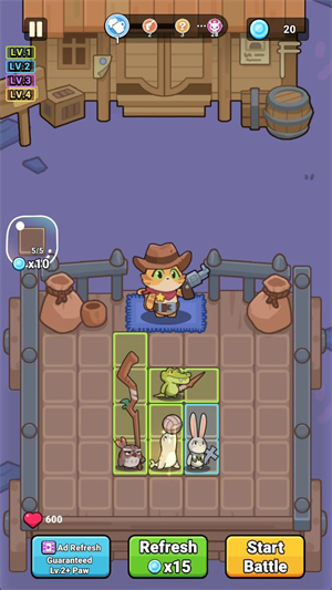 2、进入关卡后玩家可以将初始伙伴放入背包,相同的伙伴可以合并提升等级,点击refresh可以获得新的伙伴。
