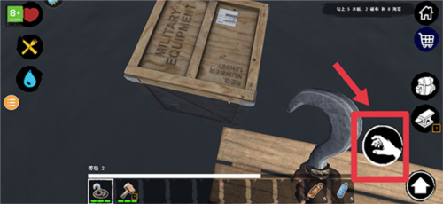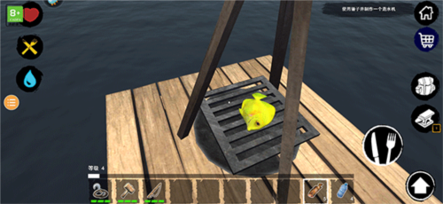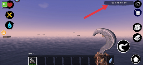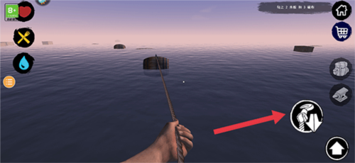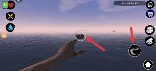 5、勾住后再次点击钩子按键,将勾住的物品拉回至木筏旁