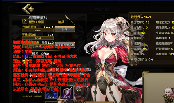 需要投资一定程度才能上场 比苏菲亚易 不会乱走 手长,必杀技 冲上去撞散敌人然后再回来,自带破甲buff 是坦克杀人 (降buff可以被净化 但是自带的不会)