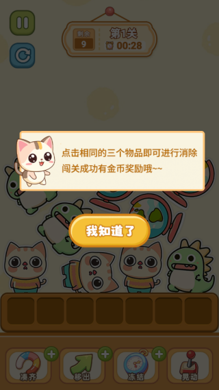 快加入《喵喵突袭队》,化身聪明的小猫咪,运用你的眼力和策略,在层层叠叠的卡牌中找出三个相同图案,让它们统统消失!