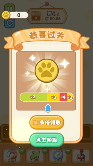 3、完成所有动物的消除任务,就可以获得猫爪币奖励,观看视频还能多倍领取。