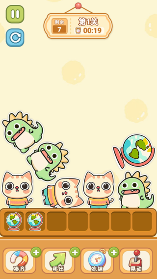 2、首先点击三个小恐龙,消除后空间就会变宽敞,然后继续将剩下的动物消除。