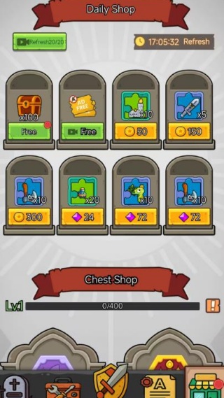 3、内置每日商店、宝箱商店和技能升级系统,提供道具更换和战力强化途径,丰富的游戏育成维度和可玩性。