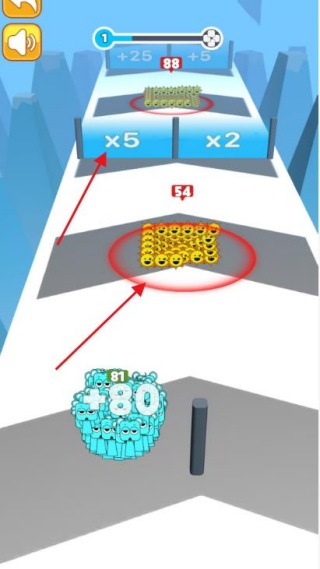 1、通过左右滑动控制角色移动,选择通过不同运算门,实时改变数字精灵的数量。