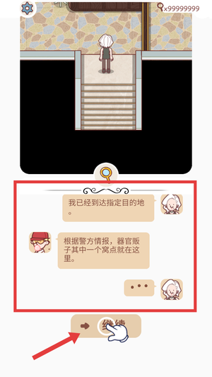 1、看到对话提示后,点击继续按钮,确认已到达指定目的地,推进寻找器官贩子窝点的任务。