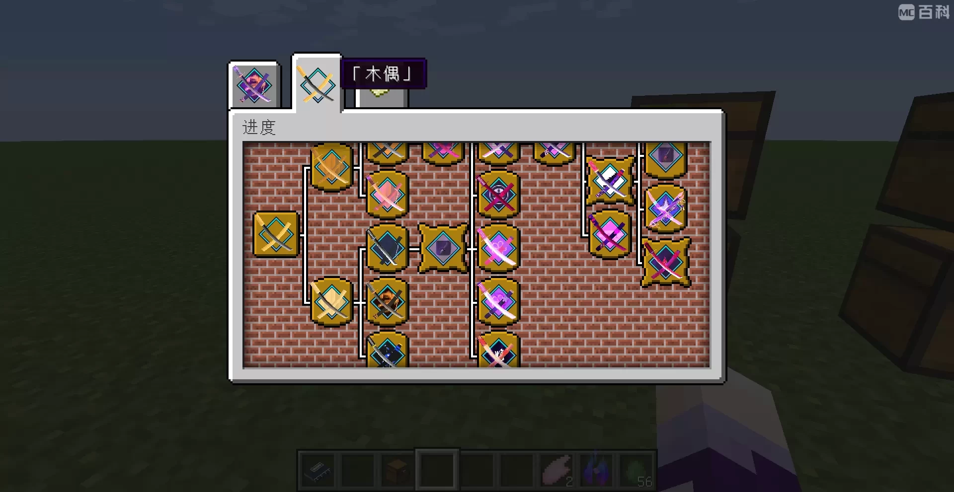 拿出之前名刀的三个卷轴,在工作台中无序合成,获得卷轴【妖刀】,同时完成进度“妖刀”。如果你已经做到这里,那么恭喜你,这个模组四分之一的任务就完成了,接下来,我们就可以开始做妖刀了。