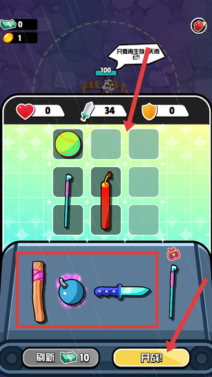 1、进入游戏后根据新手引导,用手指将下方武器栏中的装备拖拽至上方战斗格子中,两件相同武器相邻即可自动合成升级。