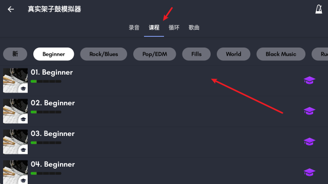 3、真实的架子鼓的声音。 由多名培训班老师编制的架子鼓节奏型,可以自动打架,跟着例程好好练练吧。