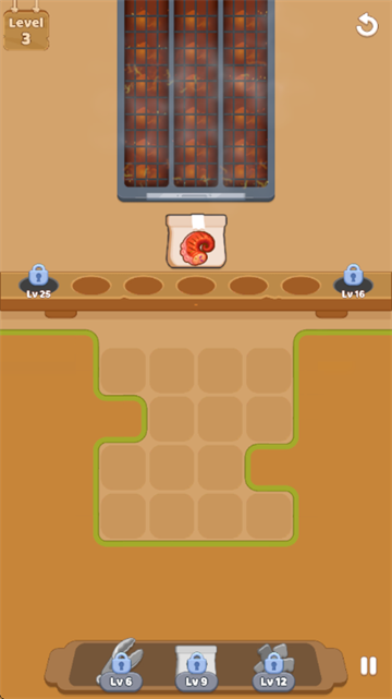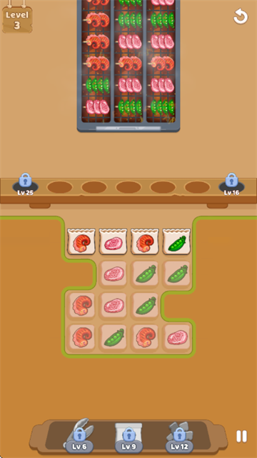 3、集齐三组同类型烧烤即可触发消除,清空画面中所有食材后,顺利完成当前关卡任务,解锁后续内容。