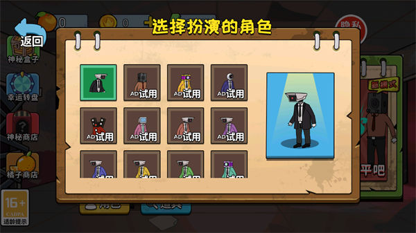 2、幸运转盘,神秘商店,橘子商店等等,游戏还为玩家们提供了超多的角色可以选择,游戏里的每一个角色都有属于自己的独特技能,还有很多的道具可以获取,玩家们只需要观看视频即可;