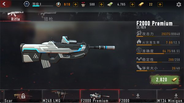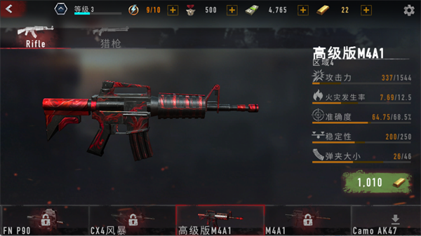 攻击力1544,火灾发生率12.5,准确度68.5%,稳定性250,弹夹大小46,需1010金条解锁。
