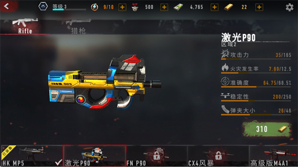 攻击力165,火灾发生率12.5,准确度68.5%,稳定性250,弹夹大小46,需310金条解锁。