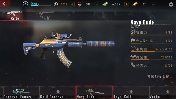 攻击力55,火灾发生率20,准确度68.5%,稳定性250,弹夹大小33,为独家战役奖励。