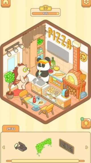 2、进入熊猫的披萨店,帮助它解锁新房间场景,扩大装饰空间的同时获得更多基础贴纸资源。