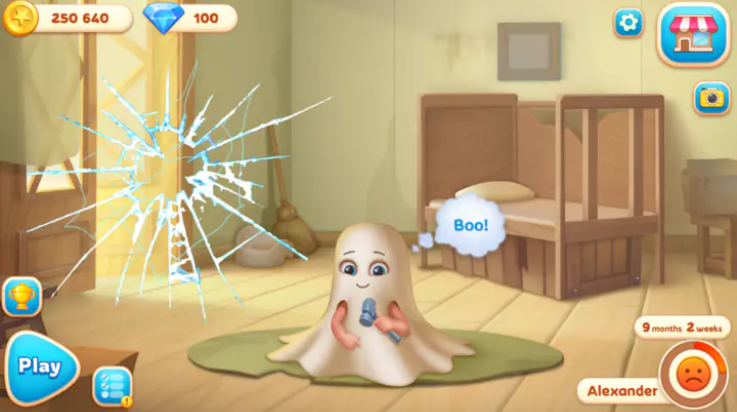 我们通过升级我们的房间属性和购买各种增加智力的道具,提升我们的孩子的能力