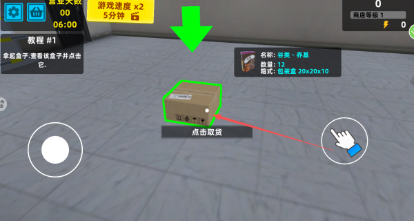 1、进入游戏后,你要利用虚拟摇杆操控着角色移动到获取旁边,点击盒子取货。
