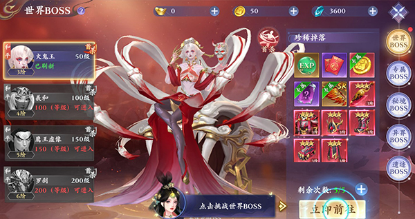 5、玩家在达到五十级级后即可解锁首领,内有世界、专属、秘境、异界、遗迹五大boss可以挑战,还有高级boss需要达到更高等级才能解锁。