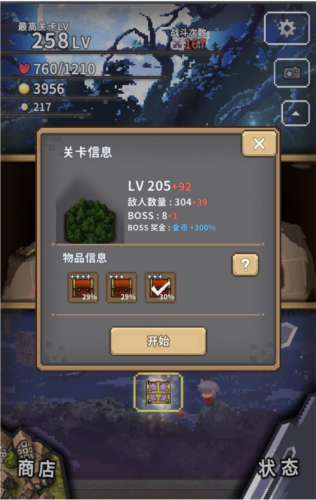 在打到200lv以上的白块后,就可以回到120lv左右开一个支路,然后继续按照金币加成优先的原则选择地图,继续打,这里推荐120lv的原因是150-200之间有较大的几率出现白块,而100lv以下的关卡加金币较少。