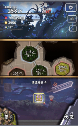 然后就开始刷图,遇到分叉路口尽量选择有额外增加金币的关卡,如果都没有就尽量选择后面可能会出现火山、沙漠、遗迹...这种会连接白块的地图,这里推荐两个必进的图:1.下图中69lv的沙滩:后面连着200%金币加成的深海还有可能连着深海白块。2.下图中205lv的森林,这里说的森林是有boss的森林,因为有boss的森林拥有高达300%的金币加成,还经常是两个连在一起,后面还会有墓地,而且这个图非常简单,不需要担心扣血问题