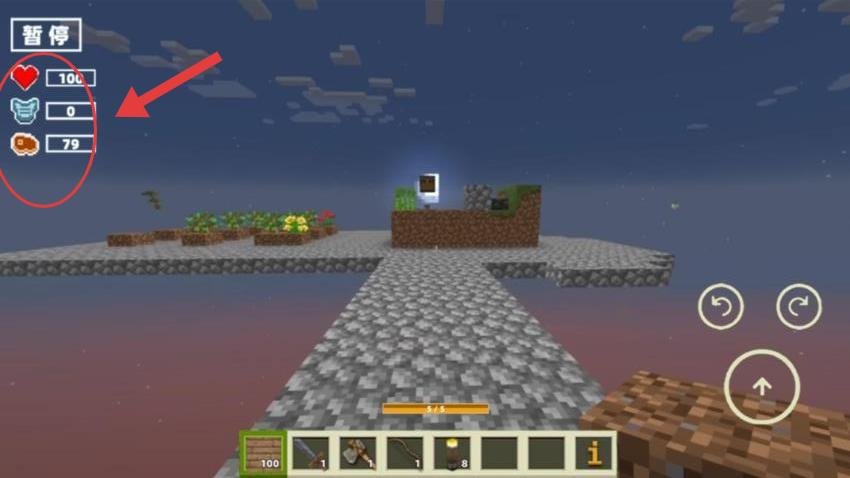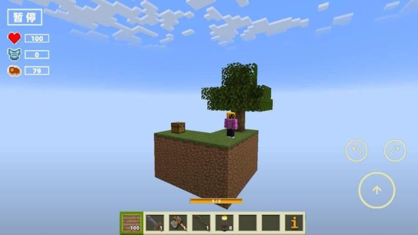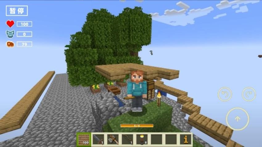 1、在浮空岛场景,使用【木板-100】搭建路径,收集植物资源,保持【生命值-100】,探索前方建筑区域,积累初始物资。