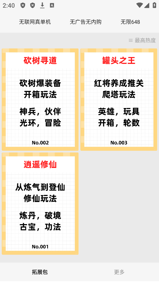 目前这款游戏内有3个拓展包可以玩,包括“砍树寻道”、“罐头之王”、“逍遥修仙”。