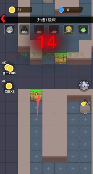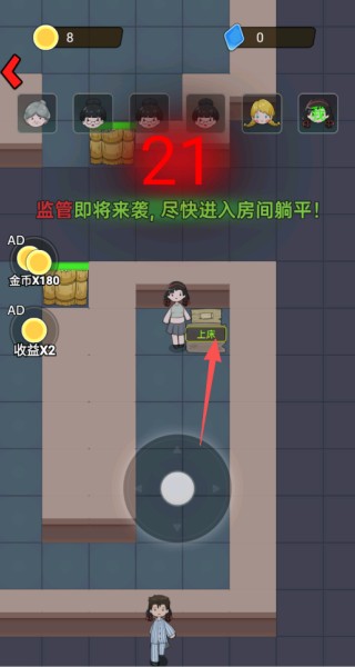 3、进入游戏需快速寻找安全房间,点击躺平按钮启动基础防御工事。