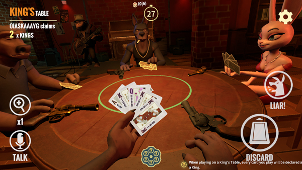 4、进入游戏后玩家轮流出牌并声明牌面数值。这个数值必须与桌面上的要求匹配(例如“国王”或“皇后”)。