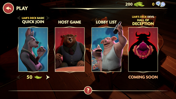 骗子酒馆玩法说明:除了自己外,其他任何玩家可以选择不相信该声明。翻开底牌后,若为骗牌,则本轮所有牌归翻牌者所有;若不是骗牌,则归不相信者所有。随后,胜利者继续出牌并喊牌。