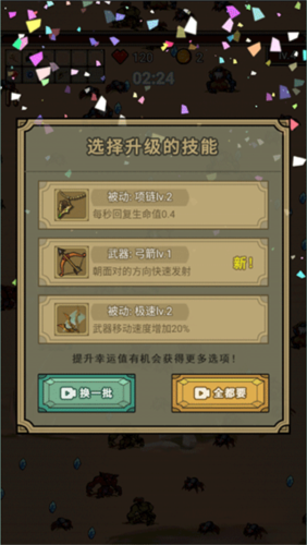 4、拾取一定的经验可以升级,每升一级可以从随机的三个技能中选择一个学习;