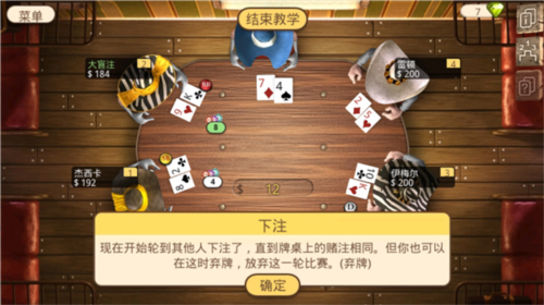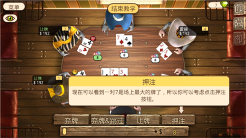 4、上手度:采用了德克萨斯纸牌的玩法,规则同唆哈类似,不过本作中要比较大小的扑克数量为7张。在详细的教程教学下游戏上手相对容易,想赢取对手则需要你的耐心和战术,并要知道何时继续和弃牌。