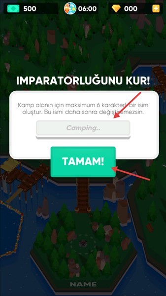 1、在闲置露营帝国游戏开始时,玩家需要根据提示创建一个营地名称,点击【TAMAM!】确认。