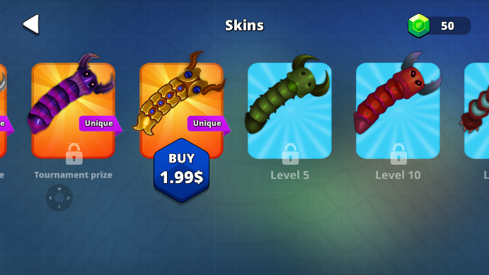 3、解锁新的蛇和蛇皮:通过不断吃掉小蛇和食物,您将解锁新的蛇和蛇皮,让您的蠕虫蛇变得更加个性化和强大。