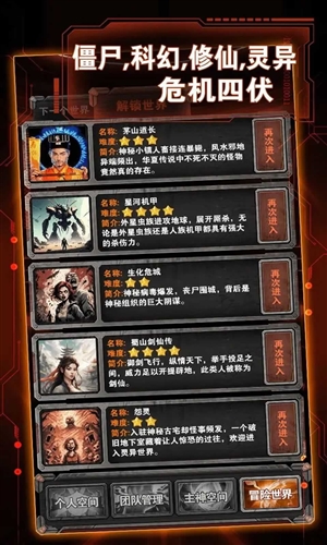 从主神空间开始下载是一款融合多元宇宙穿越与角色养成的动作仙侠手游,玩家将扮演穿梭于丧尸、修仙、赛博等平行世界的主角,通过任务选择推动剧情发展,包含丧尸末日、修仙宗门、未来科技等主题场景,每个世界拥有独立任务线,与NPC互动可解锁隐藏支线,帮助赛博世界NPC修复AI核心将开启职业分支。