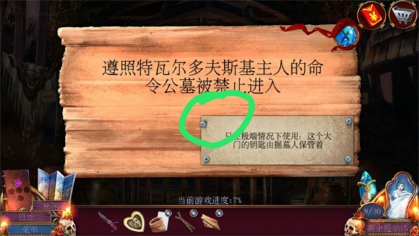 点击公墓,肉铺老板娘正在公墓门口,她走开后,点击公墓大门,大门锁着,需要钥匙打开。