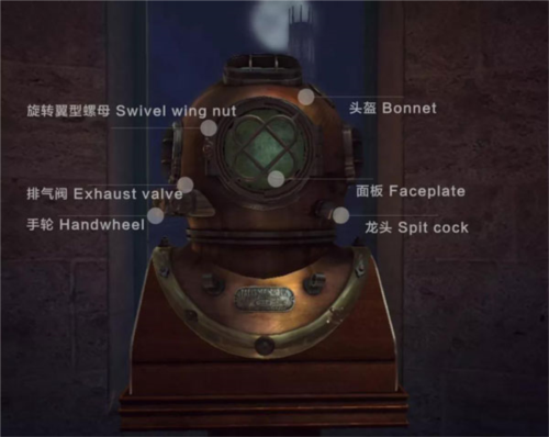 想要破解谜题,先要了解潜水头盔的结构。潜水头盔由头盔和护胸甲两部分组成。*以下图片中专有名词均以英文为准,部分英文无对应中文释义。