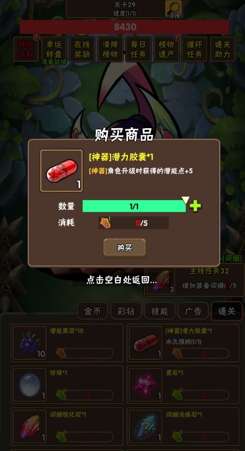 彩钻使用:先买濢毒(如上图),再买潜能提升。然后买5个技能格子(15转之前5个格子就够用了,15转后根据情况增加。),5个锤子用于给装备开孔,方便提升主属性转职。如果不喜欢使用连点器的话,则额外再买三个金手指