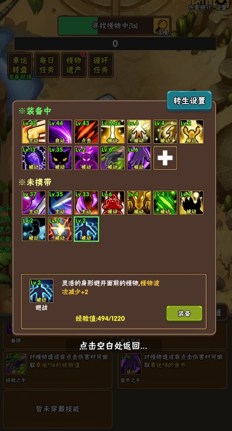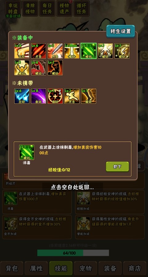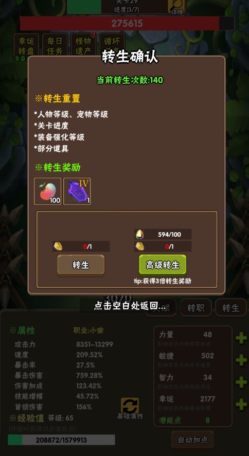游戏通关100关,会给你转生证明。转生后可以获得当前难度的通关证明。可以花费100彩钻转生奖励乘3。拥有宠物变异亡灵骑士(20转解锁)额外加1(该效果不可叠加)