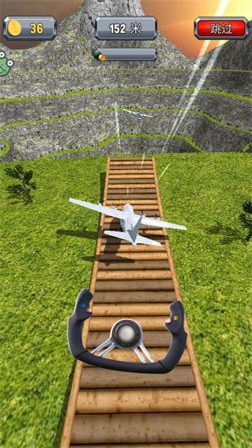 2、操控飞机前进,通过屏幕下方类似方向盘的控制装置调整方向,留意上方显示的飞行距离(如152米),可点击【跳过】略过部分环节。
