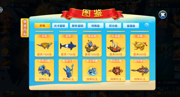 限时道具:可以获得一些特殊的游戏道具,如超级炮台、鱼雷等。