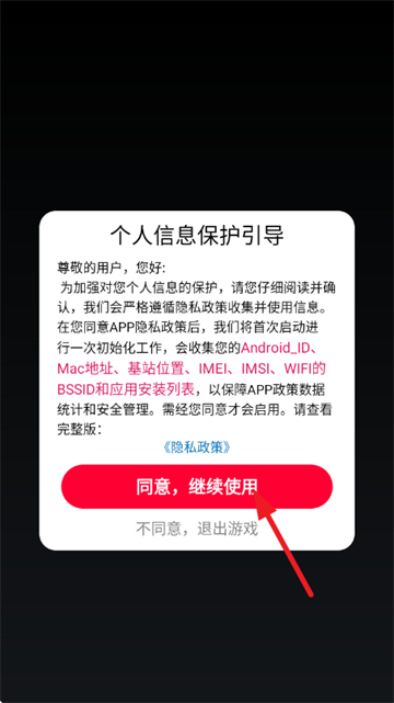 1、首先打开游戏,点击“同意并继续使用”按钮进入游戏;