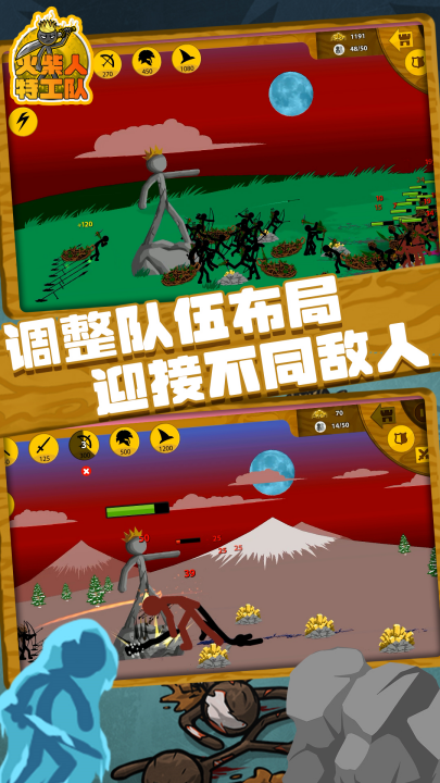 火柴人特工队游戏是一款基于火柴人题材的战争类策略游戏,游戏中玩家将亲临激烈刺激的战场,指挥你的火柴人勇士进行作战,而且游戏中有着各种火柴人士兵可供训练!游戏中玩家需要一边需要组建自己的火柴人战队,同时还必须指挥他们参加战争,只有灵活的操作和足够的智谋才能顺利击败各种敌人哟!