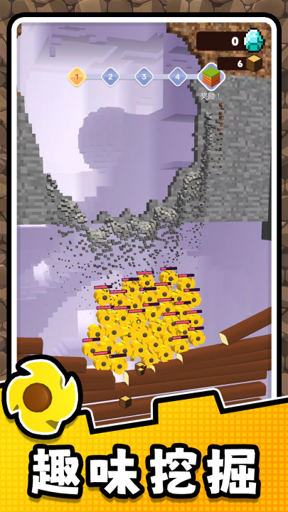 1、通过虚拟摇杆控制角色移动,使用钻头或锤子粉碎面前的岩石和障碍物。
