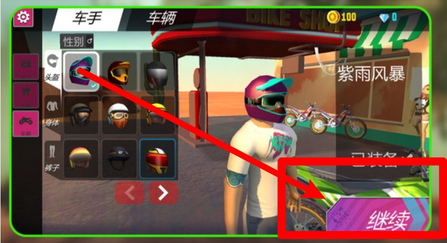 2.车手装扮:进入车手界面可自由搭配头盔与服装,点击继续保存个性造型,打造属于你的专属摩托手形象。