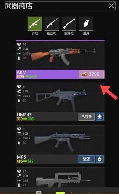 3、进入【武器商店】,根据拥有的金币数量选择并装备武器,如【AKM】【UMP45】等,提升自身战斗力。